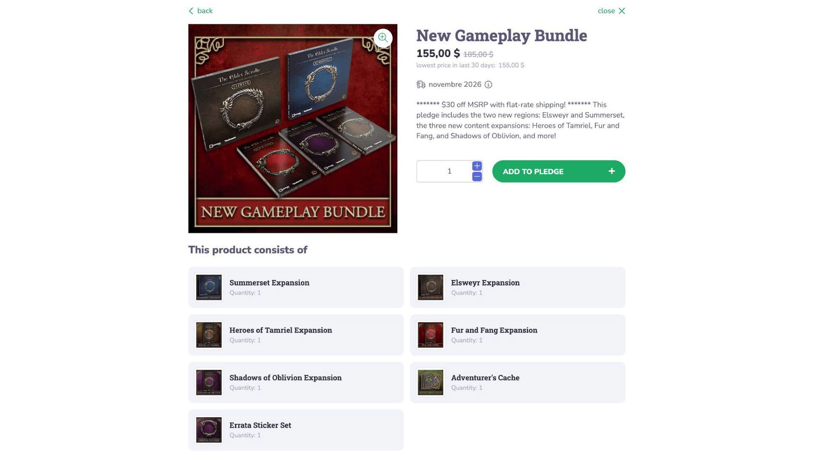 Chi non ha ancora valutato l’acquisto del gioco base The Elder Scrolls Betrayal of the Second Era, può approfittare delle condizioni vantaggiose della campagna. La scatola base infatti, se comprata in questa campagna, è disponibile a circa 193 euro (225$) contro i 239,90 che si pagano per comprare oggi sul sito ufficiale del produttore. La spedizione ha un costo comparabile e non comporta, per i clienti italiani, costi di sdoganamento (almeno era così fino all’ultima volta che abbiamo personalmente acquistato).