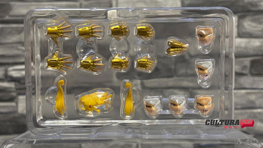 - Terzo blister: di dimensioni più contenute, contiene tutti gli accessori dedicati alla personalizzazione della figure: la ciocca di capelli compatibile con il diadema, ben cinque volti intercambiabili e un’ampia selezione di mani alternative, utili per riprodurre le pose caratteristiche di Hyoga, come l’Aurora Execution o la posizione di difesa. Nonostante le dimensioni ridotte, questo livello aggiunge grande valore espositivo e dinamico al personaggio.