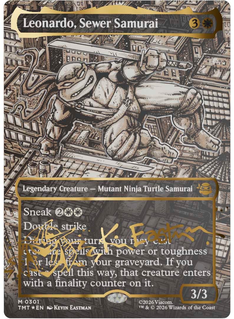 Non si tratta di un semplice richiamo estetico, ma di una lettera d'amore verso il franchise. Wizards non vuole “reinterpretare” le TMNT, ma celebrarne la storia in tutte le sue sfumature. Motivo per il quale Eastman ha inchiostrato interamente a mano i quattro artwork delle carte più rare di questo set (che saranno disponibili anche in una variante con la firma dorata di Eastman).