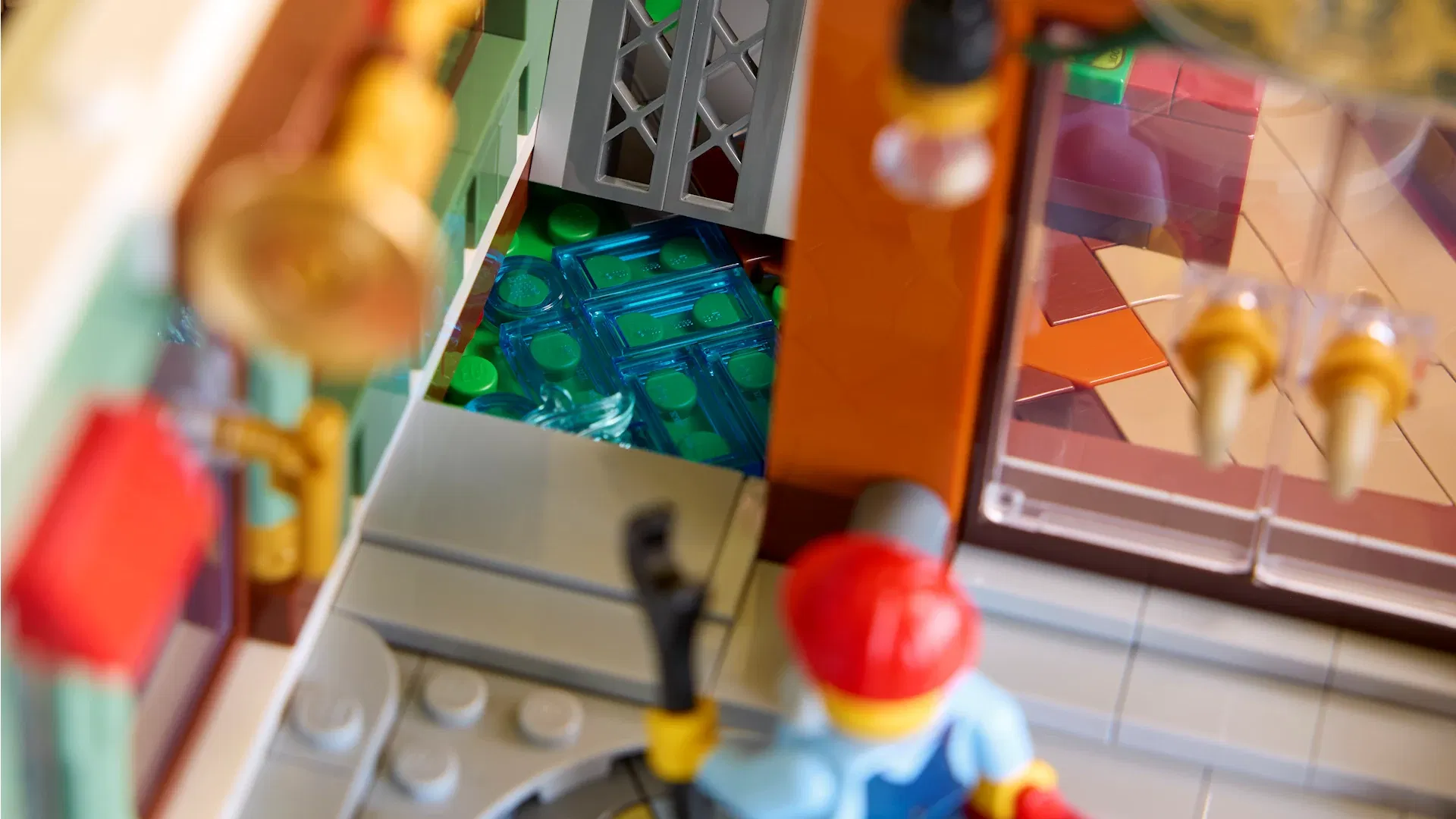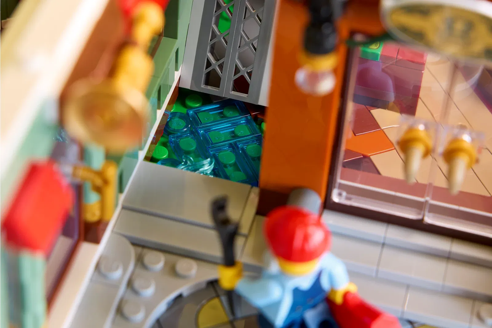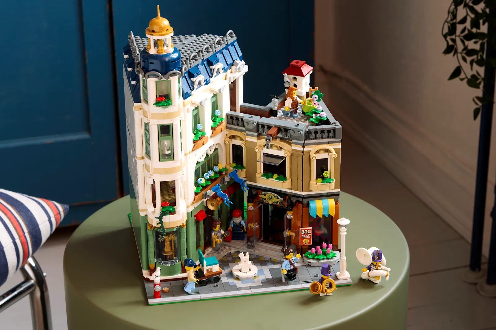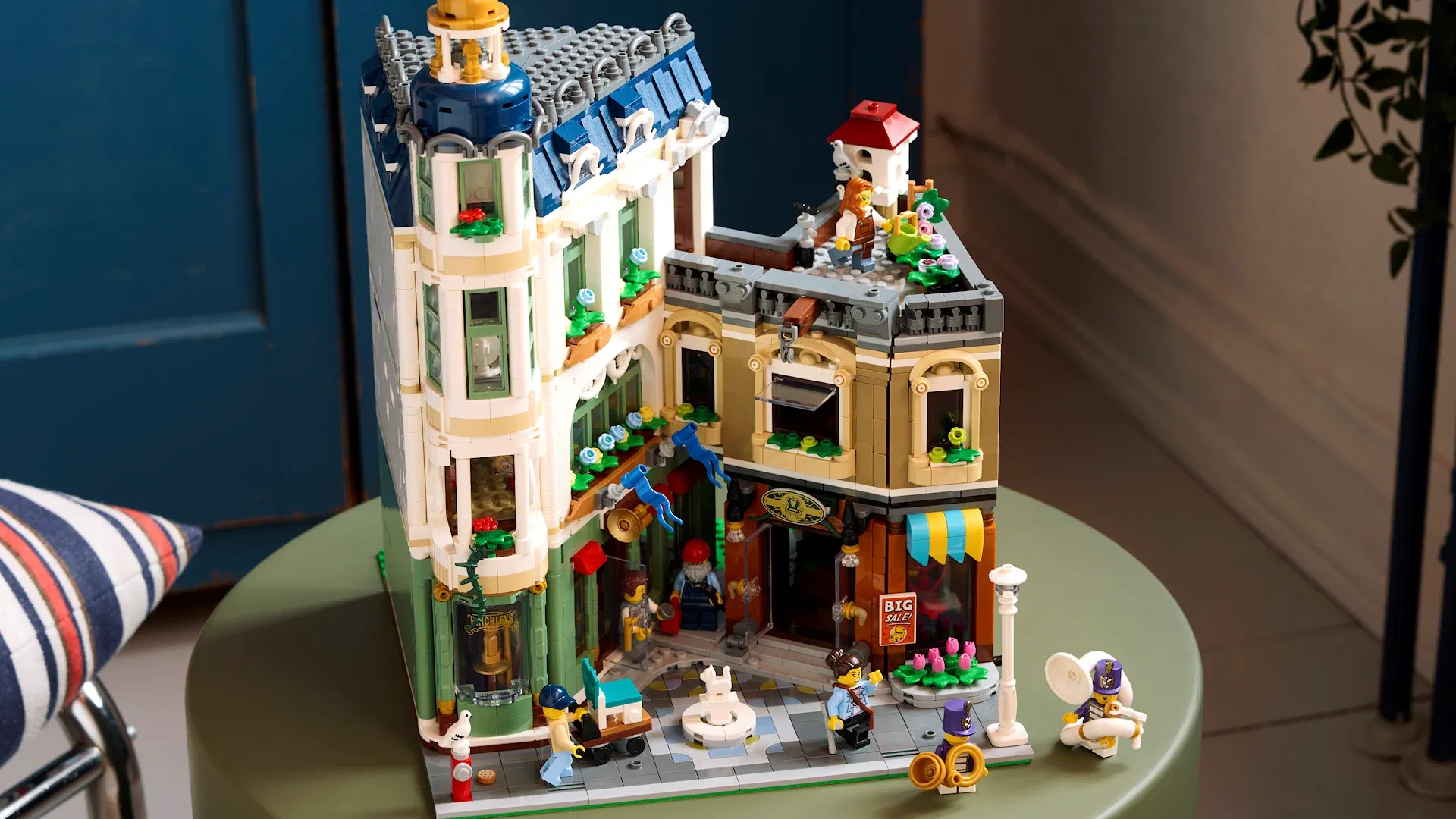La scelta cromatica del negozio di musica a tre piani merita particolare attenzione. La combinazione di blu scuro, bianco e verde sabbia richiama alla memoria il leggendario set Green Grocer, con evidenti influenze dell'architettura europea. A proposito del Green Grocer, questo nuovo modello contiene alcune ricolorazioni straordinarie di pezzi classici: un mattoncino modificato 1x2 con canale in verde sabbia, un elemento che LEGO non produceva da moltissimo tempo e che sul mercato secondario raggiunge prezzi proibitivi, oltre a mattoncini 1x8 e 1x10 nella stessa tonalità.