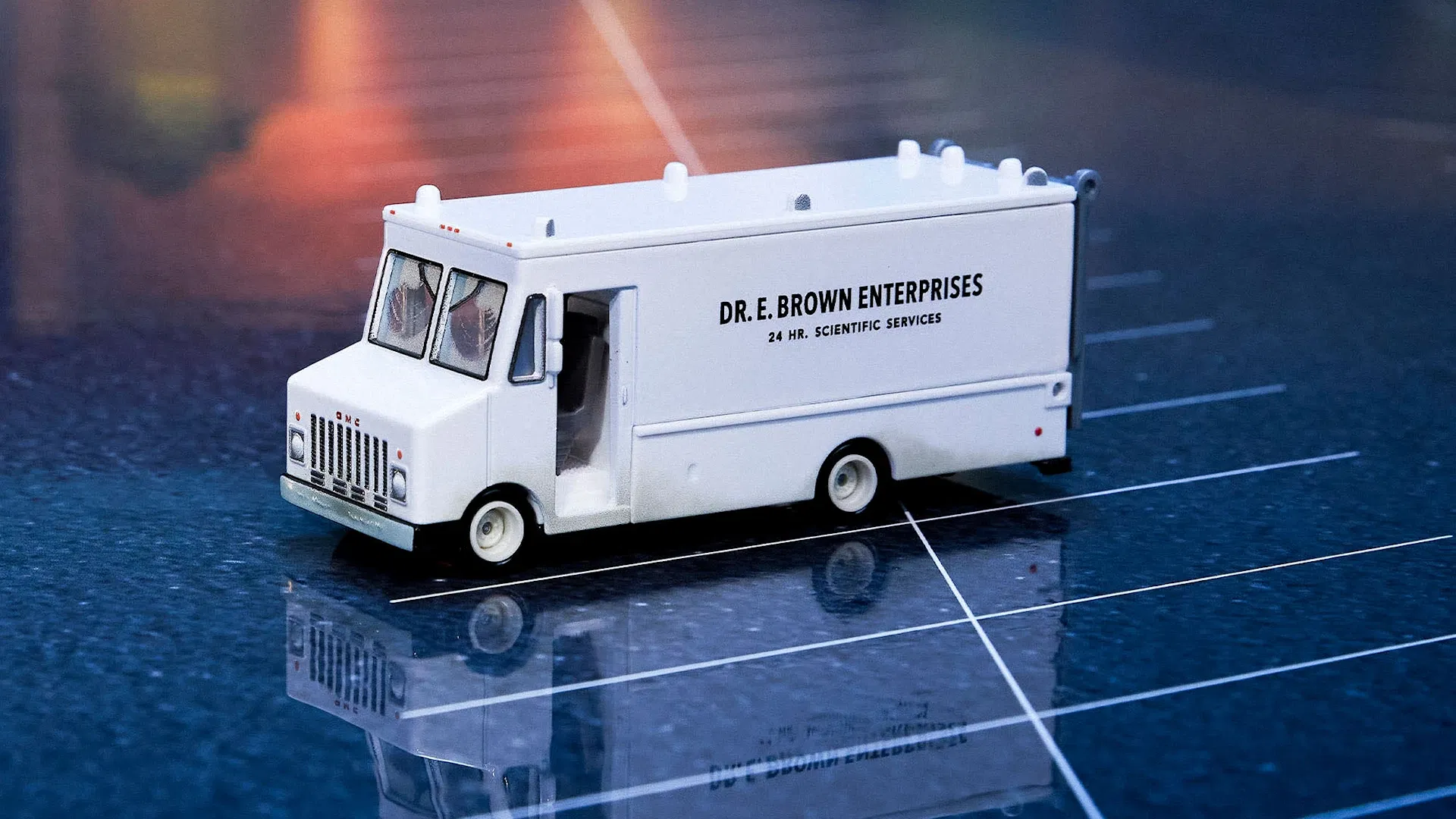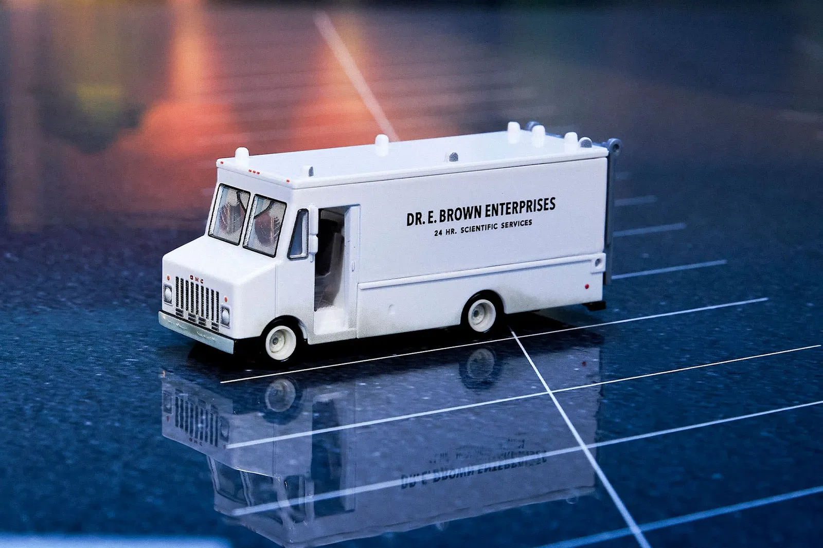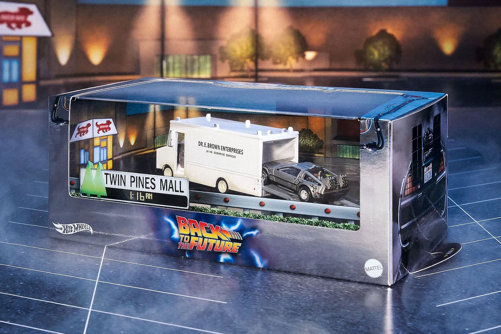 Per la prima volta nella storia della linea in scala 1:64, Hot Wheels ha prodotto il furgone GMC Value Van di Doc Brown, il veicolo che nel primo film trasporta la mitica macchina del tempo. Il modellino riproduce fedelmente le grafiche originali del mezzo, un dettaglio che i fan della trilogia riconosceranno immediatamente. Accanto al furgone trova spazio una versione aggiornata della DeLorean, realizzata appositamente per il San Diego Comic-Con 2025 con decorazioni esclusive per questo set.