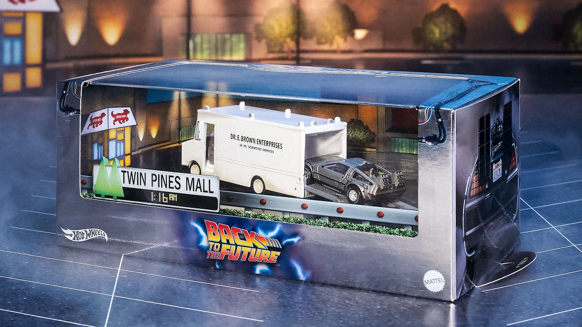 Anche Hot Wheels ha scelto di commemorare una delle scene più memorabili della saga cinematografica con un set esclusivo che ricrea il momento in cui Doc Brown svela la sua straordinaria invenzione nel parcheggio del centro commerciale Twin Pines (ve ne abbiamo parlato in questo nostro articolo). La confezione stessa diventa parte dell'esperienza, trasformandosi in un elemento interattivo che replica il dispiegamento della DeLorean modificata.