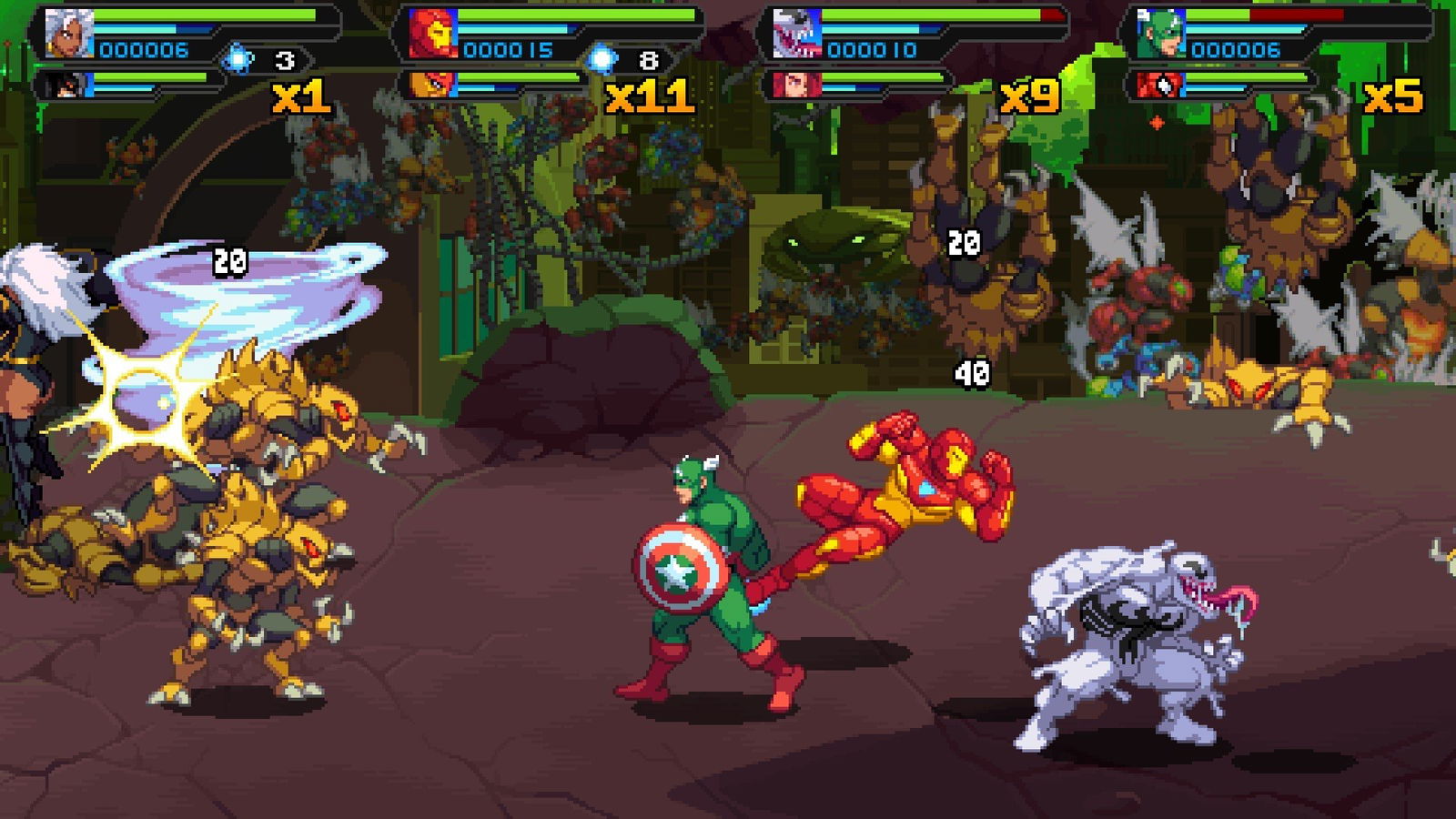 Ovviamente la storia di Marvel Cosmic Invasion riprende solo a grandi linee ciò che succede nei riferimenti cartacei originali e, con un paio di sequenze su slide, getta direttamente il giocatore alla guida di due tra quindici eroi Marvel, costretti ad unire le forze contro l’invasione del Tiranno menzionato e il suo esercito di super insetti.